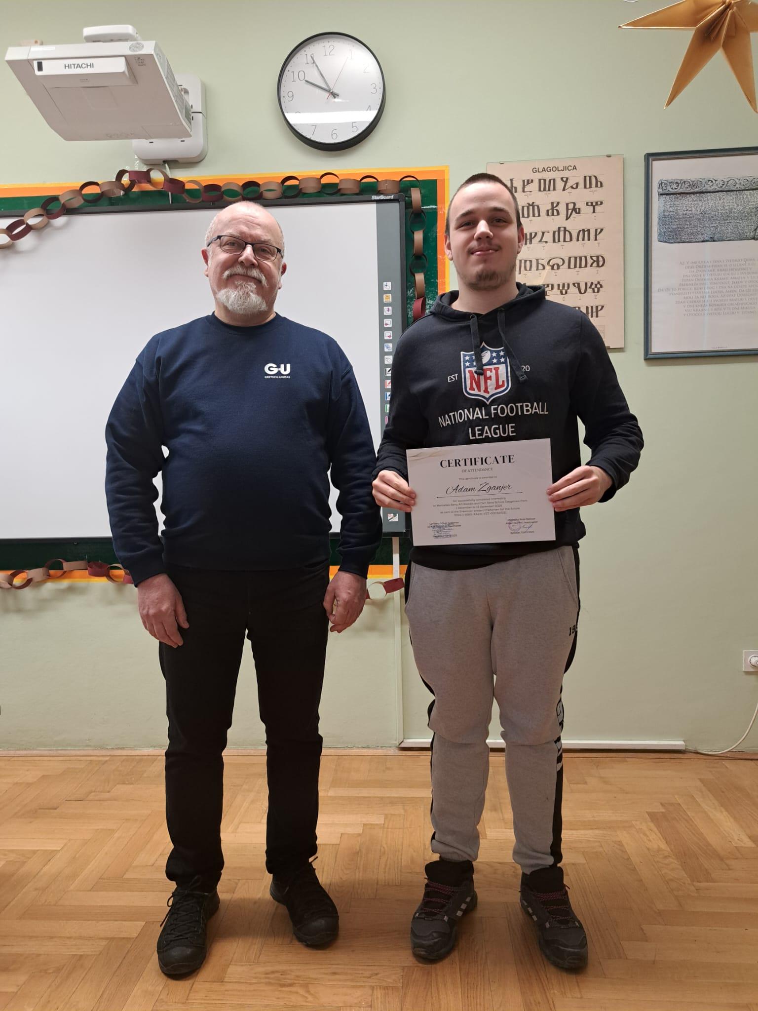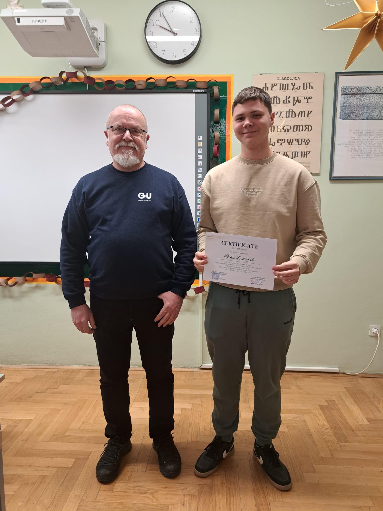 U petak 30. siječnja 2026. podijelili smo certifikate i Europass mobilnost dokumente učenicima koji su u prosincu bili u Gaggenauu na stručnoj praksi u trajanju od dva tjedna u okviru Erasmus+ projekta Obrtnici za budućnost. Certifikate je učenicima uručio nastavnik Vjekoslav Marković koji je išao s njima u pratnji. Čestitamo Luciji Sertić, Luki Duvnjaku, Adamu Žganjeru i Mihaelu Fioli te im želio još mnogo ovakvih iskustava i uspjeha u daljnjem školovanju.