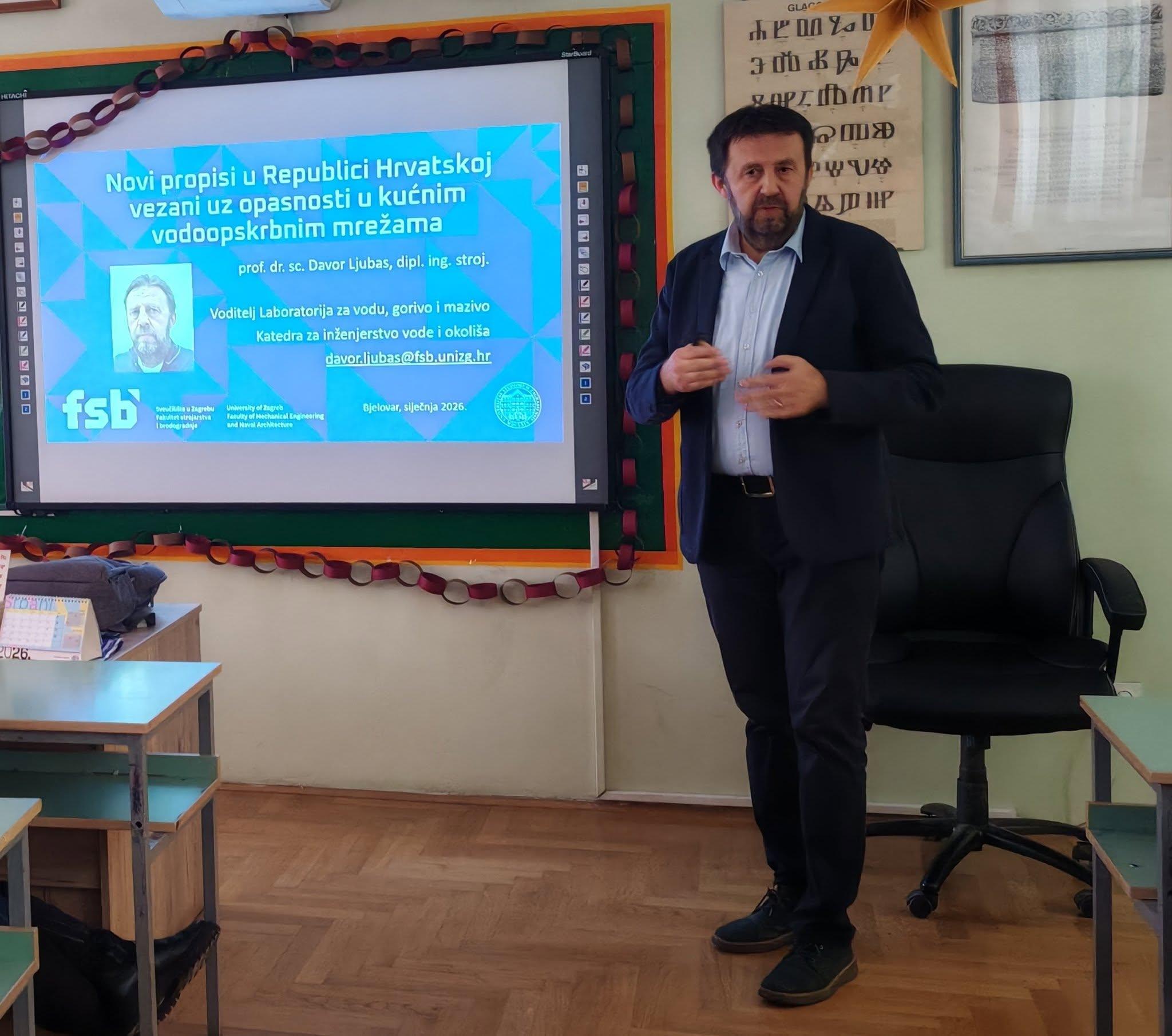 Dana 28. siječnja 2026. u Obrtničkoj školi Bjelovar prof. dr. sc. Davor Ljubas, istaknuti hrvatski znanstvenik i profesor na Fakultetu strojarstva i brodogradnje Sveučilišta u Zagrebu, održao je predavanje za aktiv strojarstva na temu regulativa pitke vode.